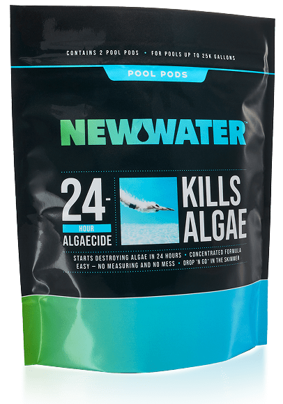 Most similar products are liquids, which are typically 90% water, and require precise weekly dosing. Plus, they’re prone to spills and stains. New Water Pool Pods remove these issues with a simple pod that drops in the skimmer. Use New Water 24-Hour Algaecide to quickly eliminate an algae outbreak.