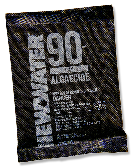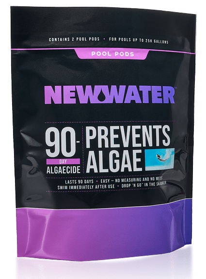 New Water 90-Day Algaecide prevents yellow, green and black algae for 90 days. Simply drop one pod per 10,000 gallons into the pool’s skimmer basket. It’s a dry, concentrated, copper-based formula that keeps algae away, leaving inviting water behind.